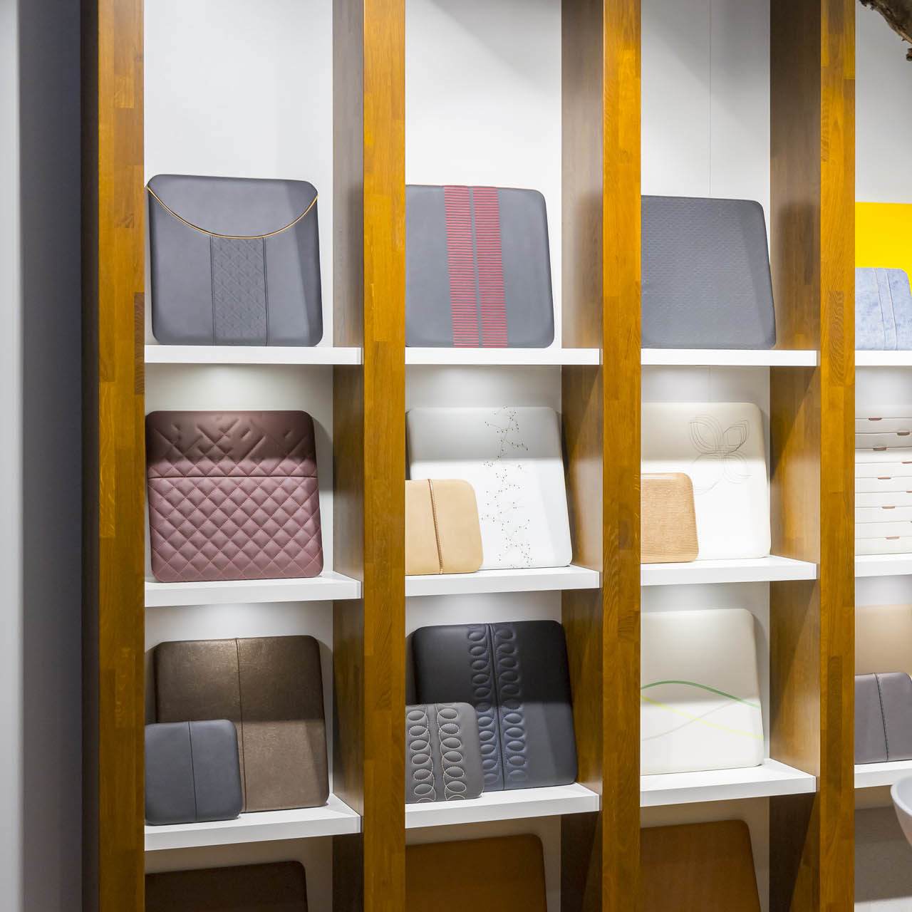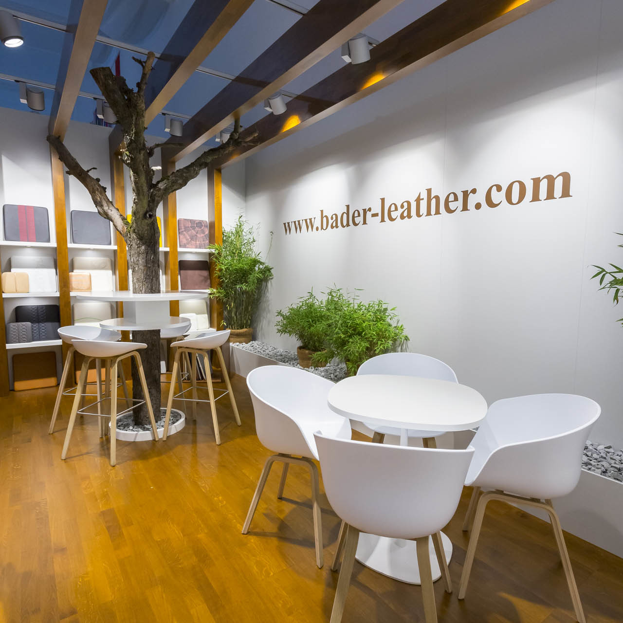Ein echtes Unikat aus Göppingen: Bader verarbeitet nicht nur in seinen Produkten feines Leder, sondern setzt auch beim Messeauftritt auf Authentizität. Das in langjähriger Zusammenarbeit mit CG entwickelte Standkonzept weicht deutlich von der Messenorm ab und setzt auf natürliche Materialien: Echtholzstreben, Parkettböden und Kuhhaut – eine „Baumbar“ anstelle einer profanen Messetheke. Es ist wie bei der Verarbeitung einer edlen Handtasche: Qualität misst sich an den Details.