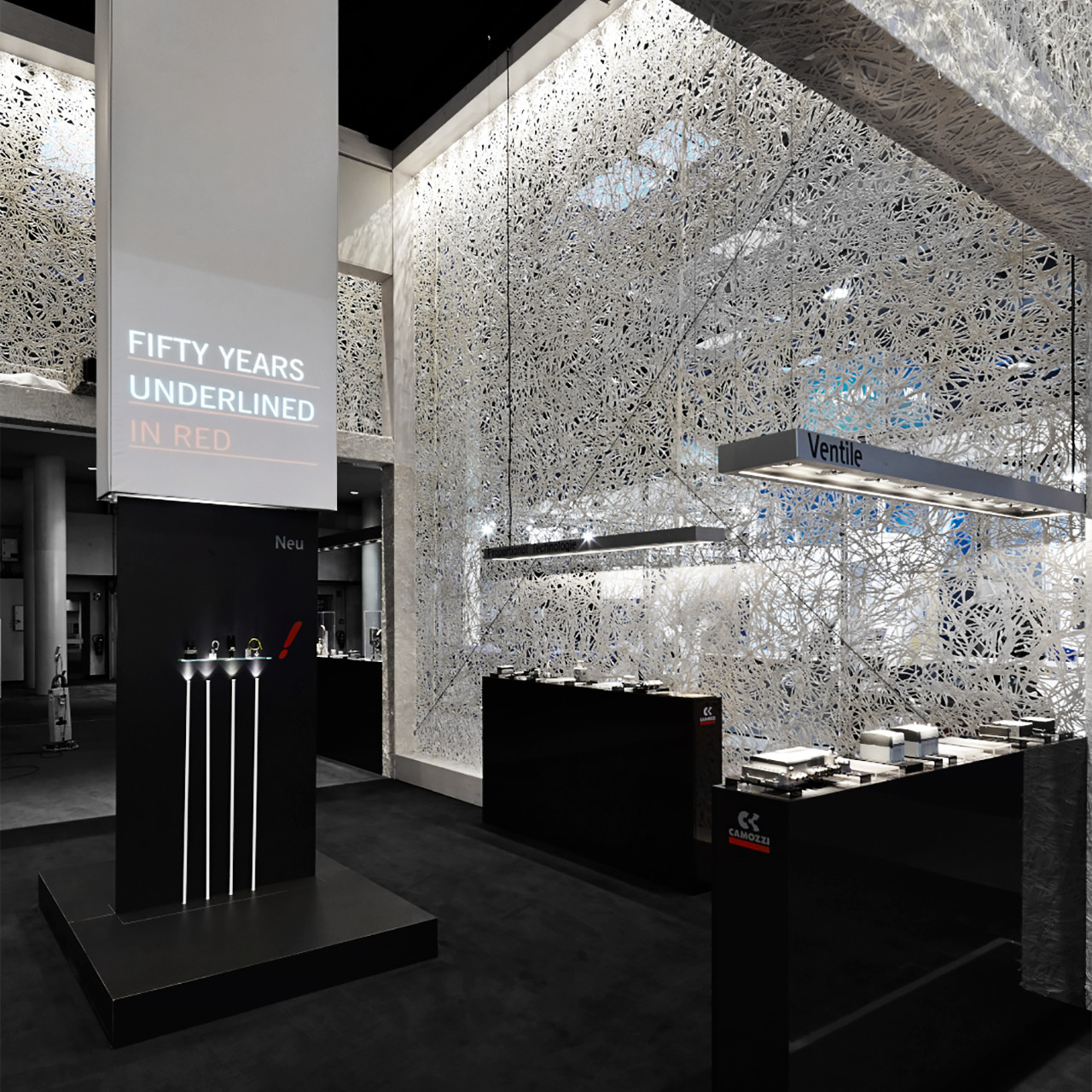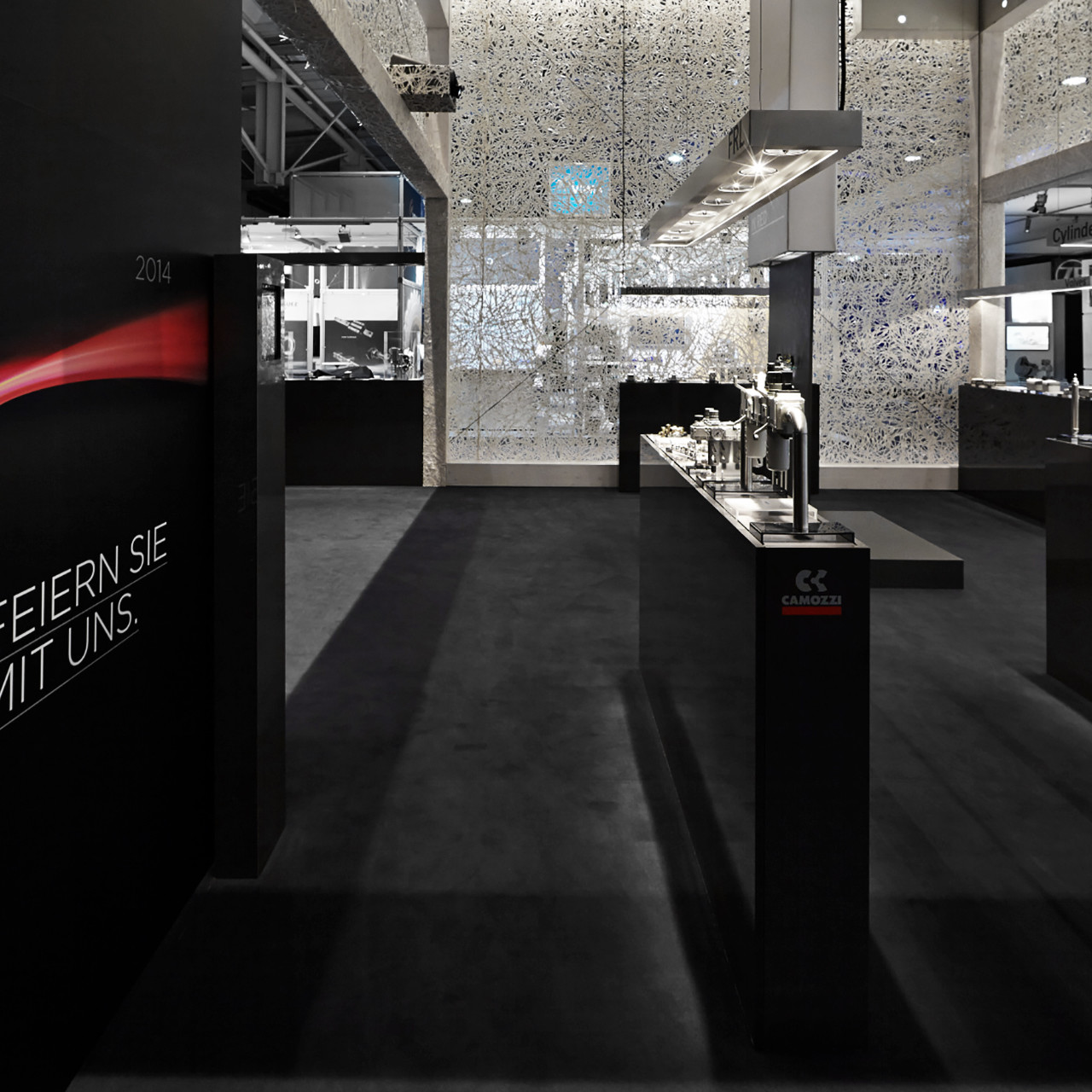 Der Camozzi-Stand auf der HMI in Hannover offenbart seine Geheimnisse erst auf den zweiten Blick. Von außen wirkt die Fläche wie ein geschlossener Raum, der sich deutlich vom Rest der Halle absetzt. Im Innenraum jedoch, wird den Besucher*innen eine großartige Aussicht und ein offenes Designkonzept geboten. Zu den klaren Linien passt die minimalistische Farbgebung in Schwarz und Weiß, die einen tollen Kontrast zur grünen Echtmooswand bildet. Elegante Gestaltung, vollständige Vernetzung und makellose Umsetzung überzeugten Camozzi, weshalb der Stand öfters im Einsatz war.