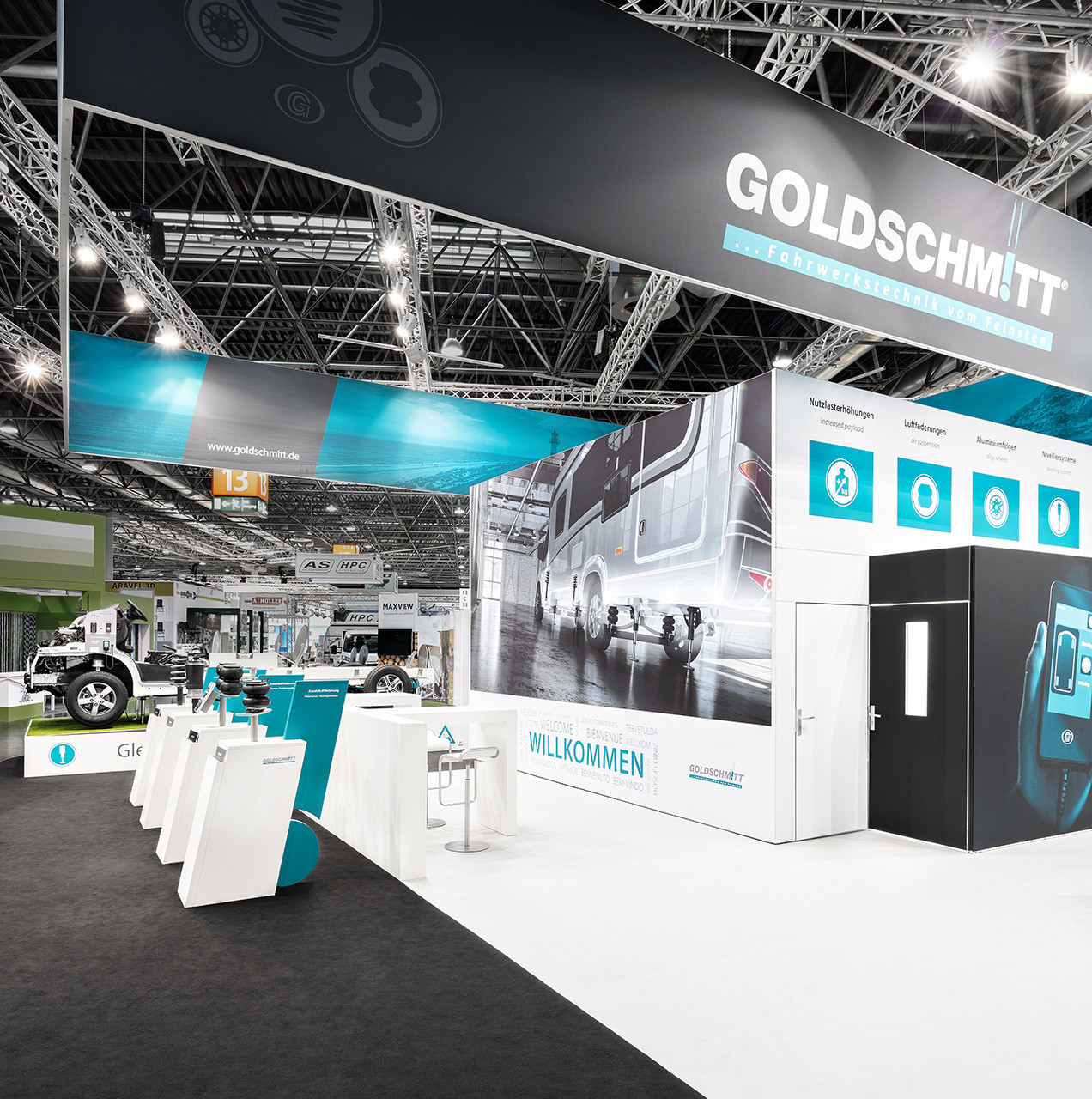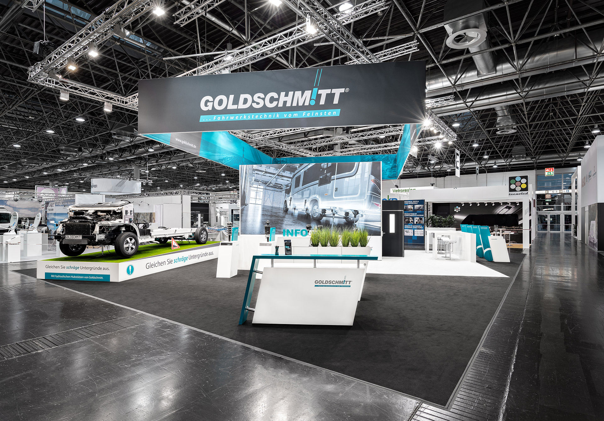 Ein Konzept, passend für viele Standflächen und schön schräg: Goldschmitts Insel war ein Hingucker auf dem Caravan Salon in Düsseldorf. Komplett in Stoff gehalten, wurde selbst die formschlüssige Vitrine harmonisch in eine Stoffkabine integriert und unterstrich den luftig-leichten Auftritt der Fahrwerksspezialisten aus Höpfingen.