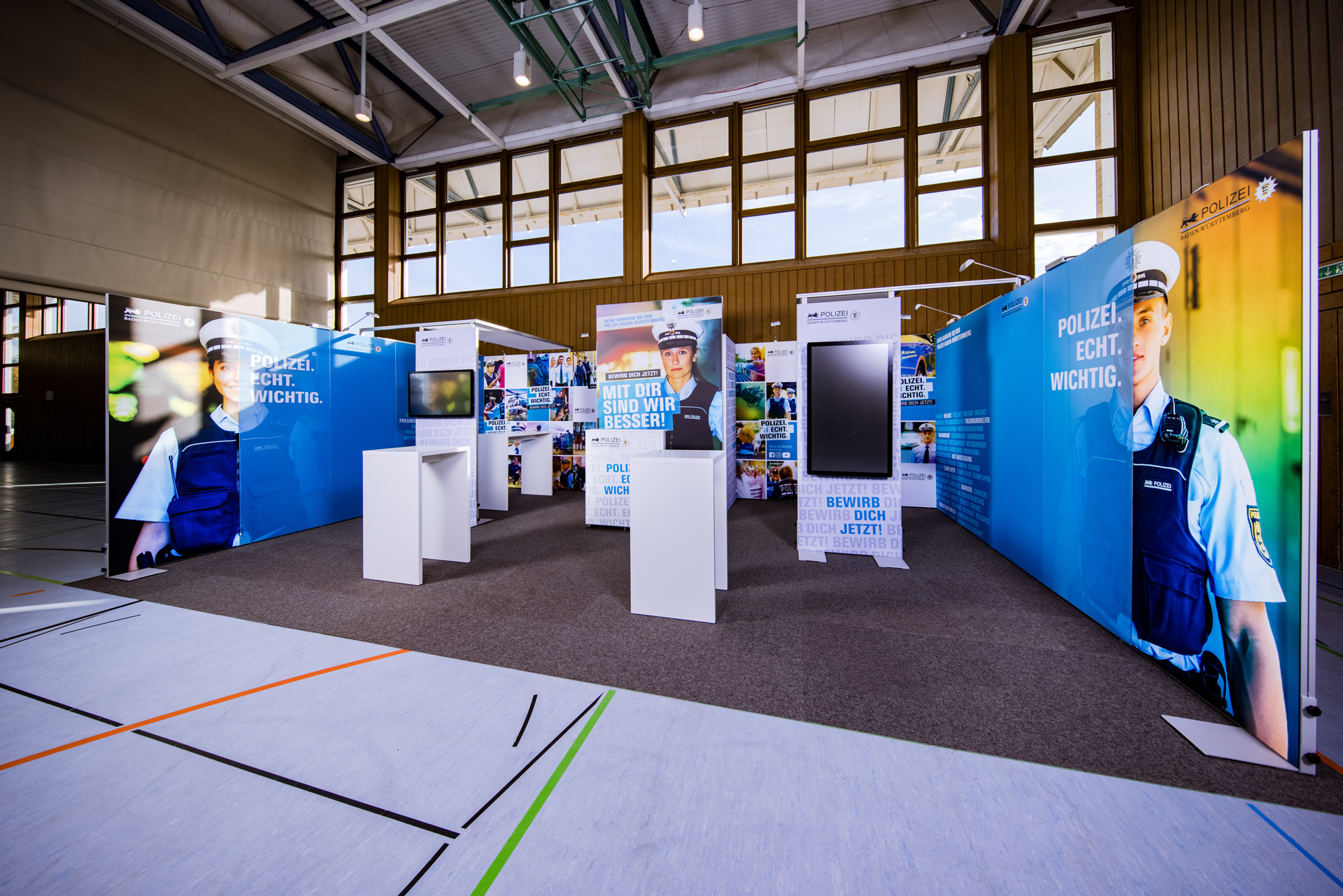 Die Unterkonstruktion bildet eine Octawall von Octanorm, sämtliche Touchscreens sind harmonisch in den Stand integriert und korrespondieren mit den Leuchtwänden aus der Octalumina-Serie. Die Stehtische auf dem Stand wurden durch CG individuell für die Polizeihochschule gefertigt.