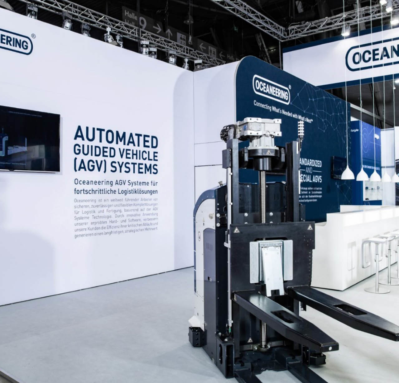Eine runde Sache auf der Logimat: Das Standdesign ist nicht nur dem Oceaneering-Logo nachempfunden, es überzeugt auch durch seine offene Konstruktion und die smarte Raumaufteilung. Sowohl Rückwand als auch Theke wurden konkav gestaltet und wirken durch den großflächigen Einsatz von Stoff leicht und elegant.